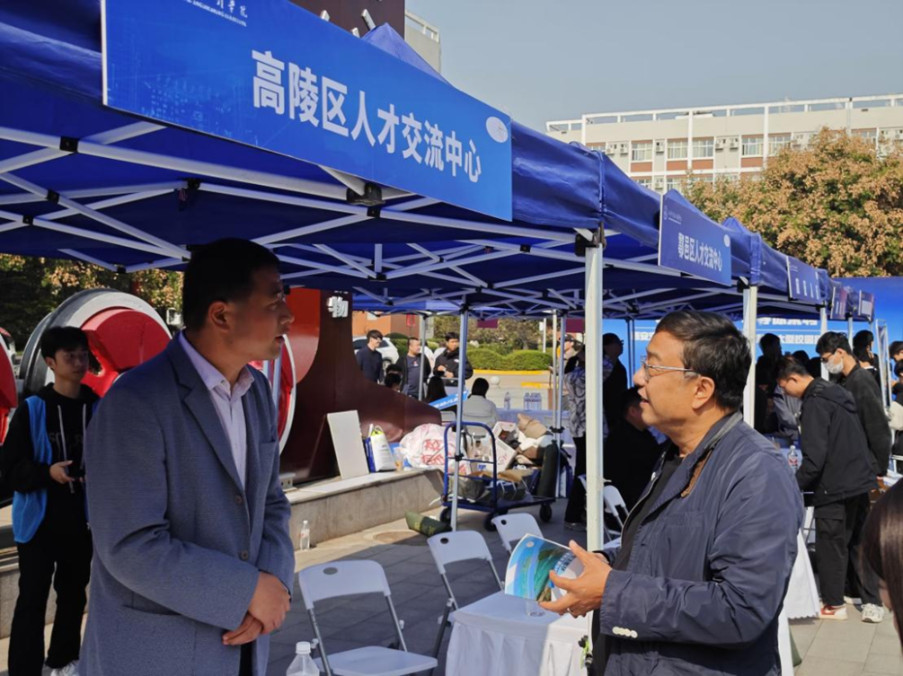 学校副校长吴伟(右一)与西安市高陵区人才交流中心交谈
