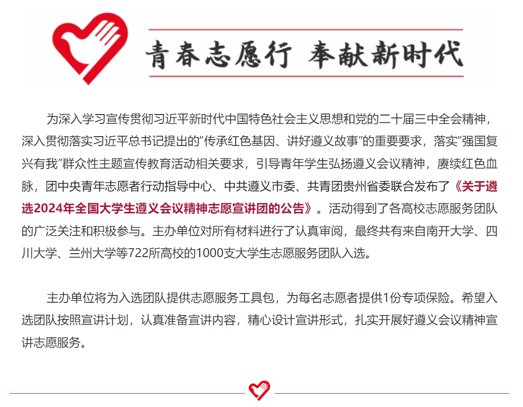 本次宣讲活动旨在深入学习宣传贯彻习近平新时代中国特色社会主义思想和党的二十届三中全会精神,落实习近平总书记提出的“传承红色基因、讲好遵义故事”的重要要求。活动还贯彻了“强国复兴有我”群众性主题宣传教育活动的相关部署,引导青年学生弘扬遵义会议精神,赓续红色血脉。团中央青年志愿者行动指导中心、中共遵义市委、共青团贵州省委联合发布了《关于遴选2024年全国大学生遵义会议精神志愿宣讲团的公告》,并得到各高校志愿服务团队的广泛关注与积极参与。主办方对所有材料进行了严格审阅,最终从722所高校中,1000支大学生志愿服务团队成功入选。
