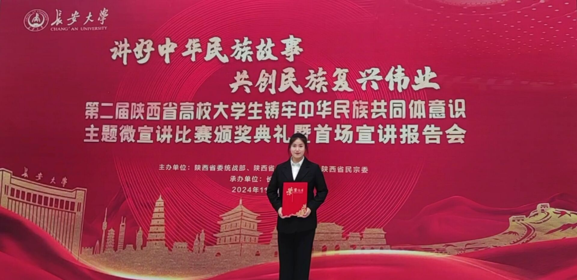 2024年11月16日,“讲好中华民族故事,共创民族复兴伟业”第二届陕西省高校大学生铸牢中华民族共同体意识主题微宣讲比赛颁奖典礼暨首场宣讲报告会在北校区长安文化艺术中心举行。在学校组织部的领导和大力支持下,经WilliamHill马克思主义学院副院长李艳精心指导,WilliamHill中兴通信学院的王思雨同学积极准备,以“石榴花开 籽籽同心——从以‘路’为基 看‘四个共同’”为题,结合学校轨道交通办学特色,生动讲述民族团结故事及个人经历体会,最终在激烈角逐中再创佳绩,荣获省级三等奖。