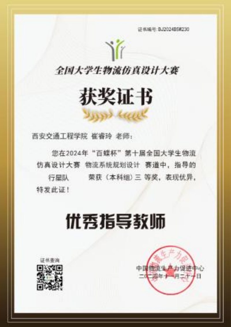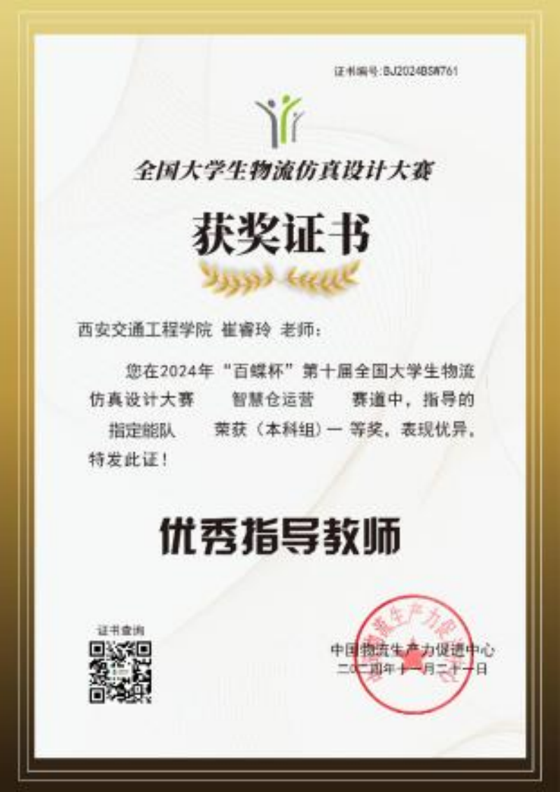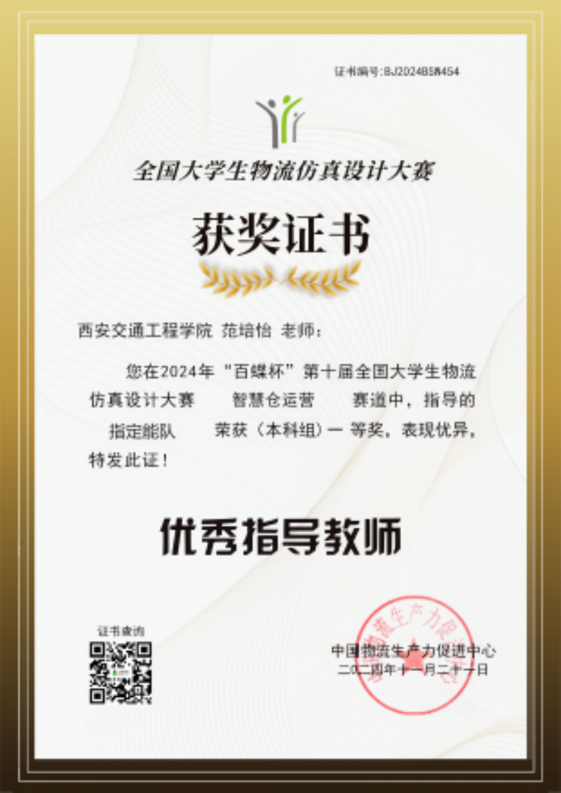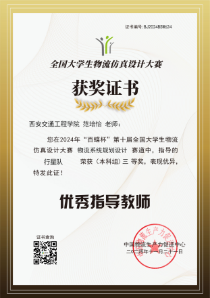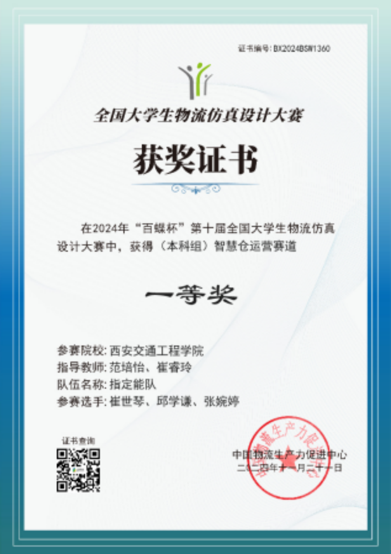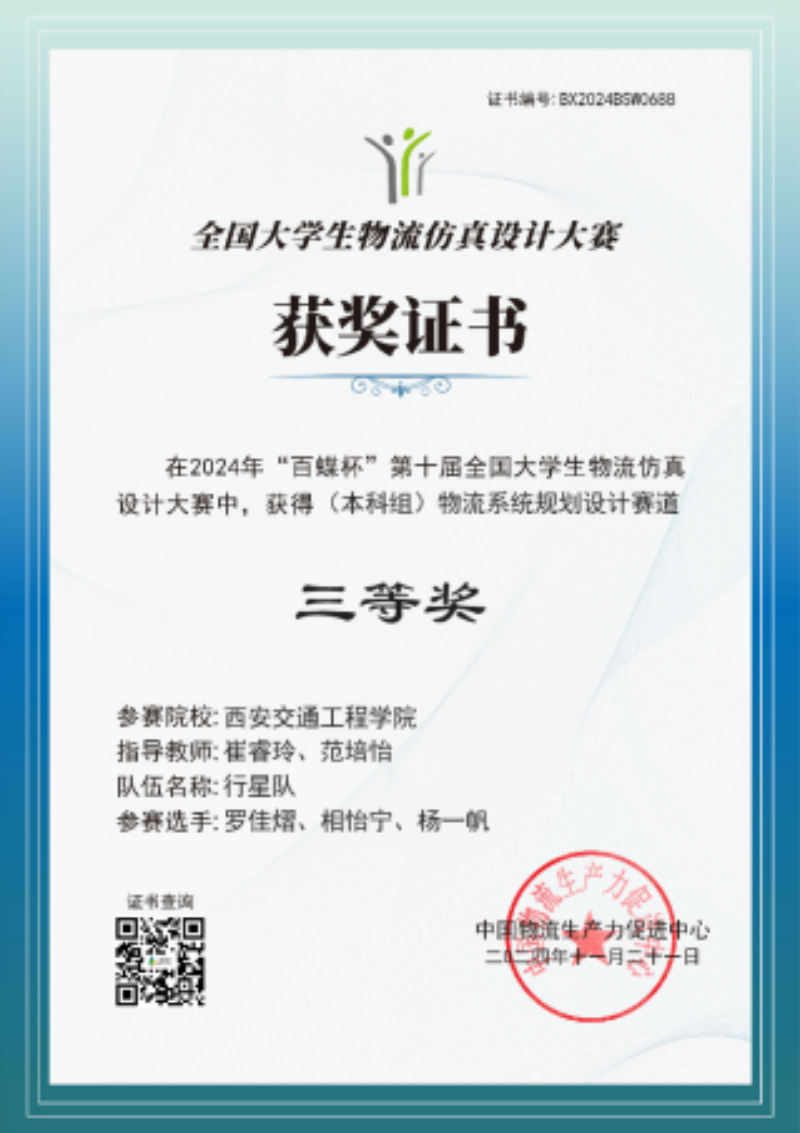 11月25日,2024年“百蝶杯”第十届全国大学生物流仿真设计大赛圆满落幕。WilliamHill物流管理专业学生凭借出色设计荣获一等奖、三等奖的优异成绩。其中物流管理2203班崔世琴、邱学谦和张婉婷获(本科组)智慧仓运营赛道一等奖,物流管理2203班罗佳熠、相怡宁和杨一帆获(本科组)物流系统规划设计赛道三等奖,物流管理教师崔睿玲、范培怡获优秀指导教师证书。