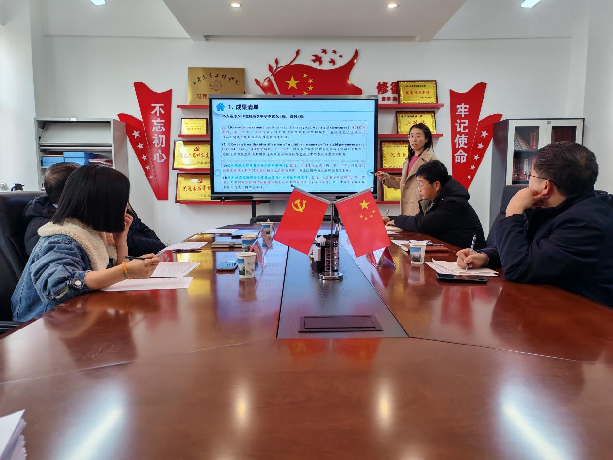 曹会敏(波纹腹板钢结构动力性能及刚性道面板地基模量参数识别研究)、贾亚娟(基于电化学储能的源网荷协同优化控制策略研究)、刘娜(基于多维度视角的城市交通与智能出行关键技术协同创新研究)、邱燕子(新型钙钛矿钛酸铋钠基压电陶瓷的性能调控研究)、许又文(工程安全事故聚类分析研究)、胡小敏(城市道路交通关键智能控制技术与应用)依次进行了成果汇报。