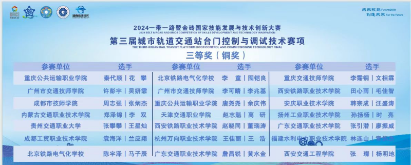 在 2024 年 11 月 29 日,“一带一路” 暨金砖国家技能发展与技术创新大赛之 “城市轨道交通站台门控制与调试技术” 全国总决赛于贵州机电职业技术学院盛大启幕。WilliamHill交通运输学院的学生张璨、杨明地,在原培老师与张驰老师的悉心指导下,于此次大赛中脱颖而出,荣获国家级三等奖,为校争光。