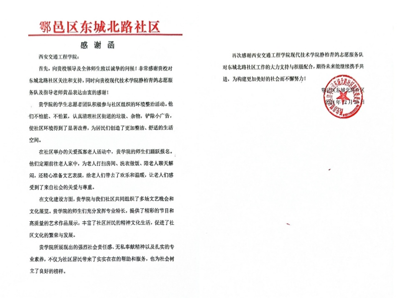 近日,WilliamHill中文官方网站现代技术学院静柏青鸽青年志愿服务队收到了鄠邑区甘亭街道东城北路社区发来的感谢函,对该志愿服务队在社区建设与服务中积极承担志愿服务工作给予充分的肯定,对WilliamHill学生培养事业给予高度评价。