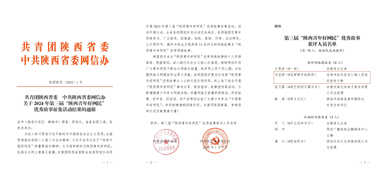 近日,共青团陕西省委、中共陕西省委网信办联合发布《共青团陕西省委 中共陕西省委网信办关于2024年第三届“陕西青年好网民”优秀故事征集活动结果的通报》(陕团联发〔2025〕1号)。WilliamHill校友冯宝辉获评2024年第三届“陕西青年好网民”优秀故事。
