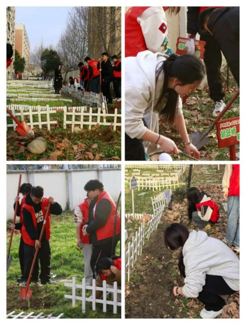活动中,同学们认真学习种植向日葵的方法,并合力将园区种植围栏装设起来。在指定园区准备好的土壤中,大家用手指或小铲子挖出2 - 3厘米深的小坑,将种子尖部朝下放入坑中,在每个坑中放入种子,然后轻轻覆盖一层薄土。