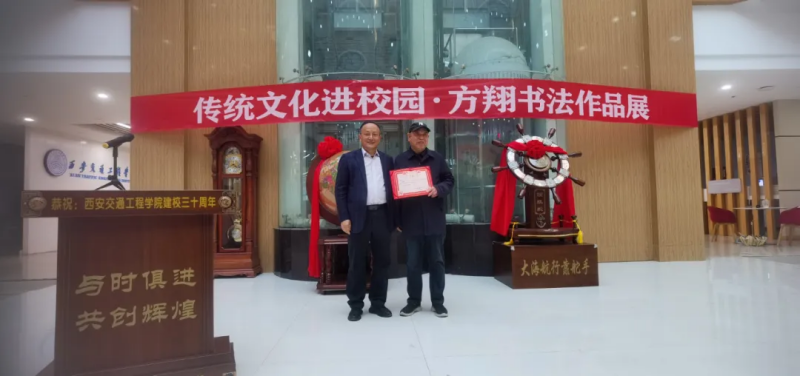 仪式上,张慧理事代表学校接受了方翔先生向学校捐赠的他创作的《千字文》长卷。学校聘请方翔先生为名誉书法教授,并由学校党委书记李萍教授为方翔先生颁发聘书。学校图书馆馆长宇文高峰编审为方翔先生颁发作品收藏证书。