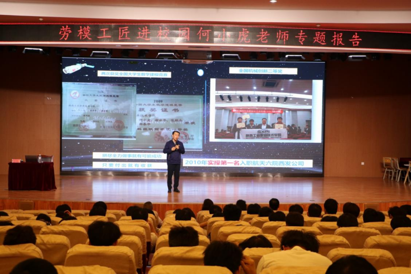 报告会上,何小虎以“技艺成长与匠心铸就”为主题,首先详细阐述了航天工业对于国家发展的重大意义,并深刻探讨了工匠精神在当今社会的时代价值,尤其是在创新驱动发展战略背景下,工匠精神对于促进技术进步的关键作用。其次何老师从自己的亲身经历出发,向同学们分享了从普通工人到工匠十年磨一剑的耐心与积累,谈到自己以榜样为标杆设立自己的人生目标,在过程中要做到不提困难先做事、会干活能干活、勤思考、不断学习,付出120%的努力完成每次的竞赛,让青春在奉献与追求中闪烁出更加耀眼的光芒,用自己的切身经历深刻诠释了工匠精神的内涵——执着专注、精益求精、一丝不苟、追求卓越。最后与同学们共勉了人生要脚踏实地、全力以赴、做好准备、坚定信念,秉着“要干,就干出个模样”的劲头,把普通的工作做到极致,在学习中动手实践、出力流汗,接受锻炼、磨炼意志,培养正确的劳动价值观和良好的劳动品质,为实现第二个百年奋斗目标贡献青春力量!
