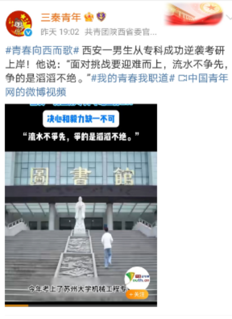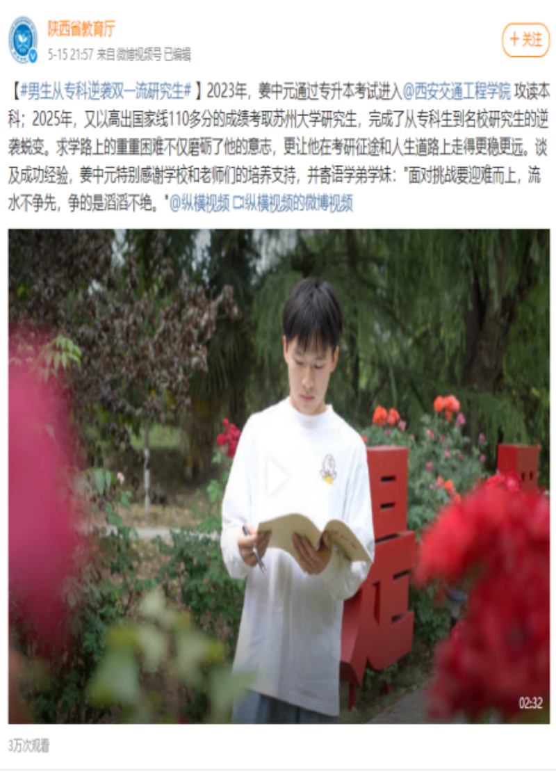 他的故事被陕西省教育厅官微,中国共青团网,中国青年网、纵横视频、三秦青年、新京报教育新闻等多家媒体转载报道;社交媒体上,# 专科生逆袭 211# 的话题阅读量持续攀升,他的事例不仅成为个人奋斗的辉煌篇章,更为无数学子奋勇向前提供了精神动力。目前,姜中元的事迹已成为校园热议话题,激励着更多学子在逆境中突破自我。