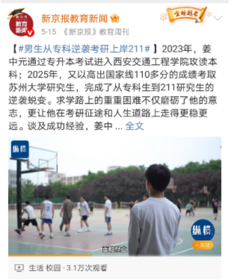 聚焦热议:男生从专科逆袭考研上岸211