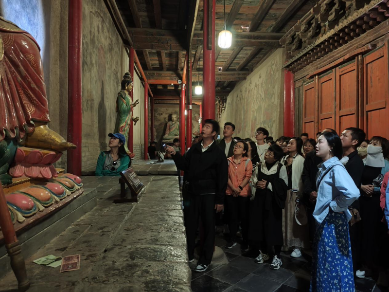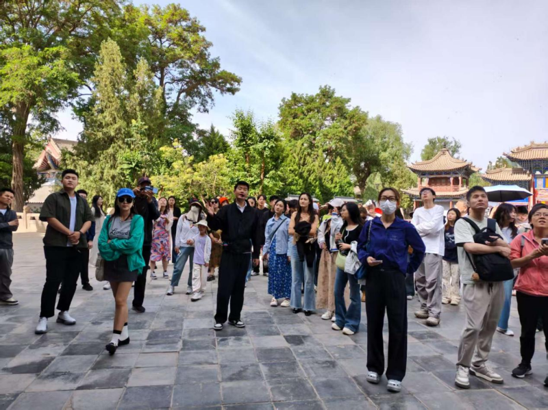 研学过程中,音乐学专业师生通过实地参访与艺术采风,深切感受到张掖丰富的历史文化积淀和独特的自然景观魅力。大佛寺作为丝绸之路上的文化遗产,展现了多元宗教艺术的融合,师生通过考察西夏佛教壁画、经变乐舞图像,分析丝路佛教音乐东传的物证,现场开展专题研讨,深化对古代多民族音乐交融的理解。张掖市博物馆的文物展览则为学生提供了系统的人文历史素材,在“历史民族厅”“非遗陈列馆”,团队了解了匈奴、回鹘、西夏等古代民族乐器和裕固族民歌档案,探究地域音乐的文化层积现象,为“中国音乐史”课程提供鲜活案例。而丹霞地貌以其壮丽色彩和地质奇观,为师生采集丹霞色彩、山体韵律等视觉元素,激发跨学科艺术创作思维。