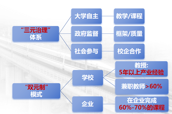 德国应用技术大学构建了以大学自主性、政府监督和社会参与为核心的三元治理体系。该体系通过校企合作的“双元制”模式,着重于职业能力的培养,其中60%至70%的课程内容在企业环境中完成。在师资构成方面,教授职位要求应聘者必须拥有至少5年以上的产业界工作经验,同时,兼职教师的比例超过60%。