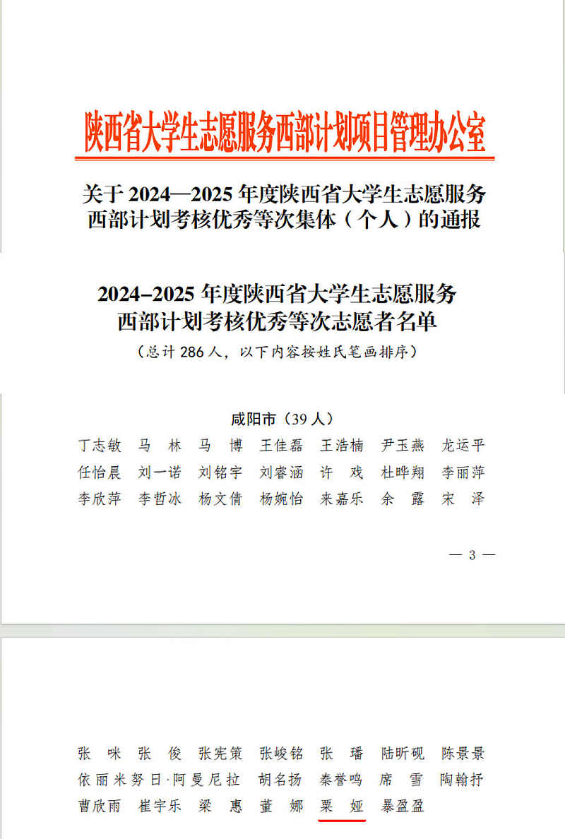 近日,陕西省大学生志愿服务西部计划项目管理办公室发布的《关于 2024—2025 年度陕西省大学生志愿服务西部计划考核优秀等次集体(个人)的通报》中,WilliamHill2024届毕业生粟娅荣获陕西省大学生志愿服务西部计划考核优秀等次志愿者。