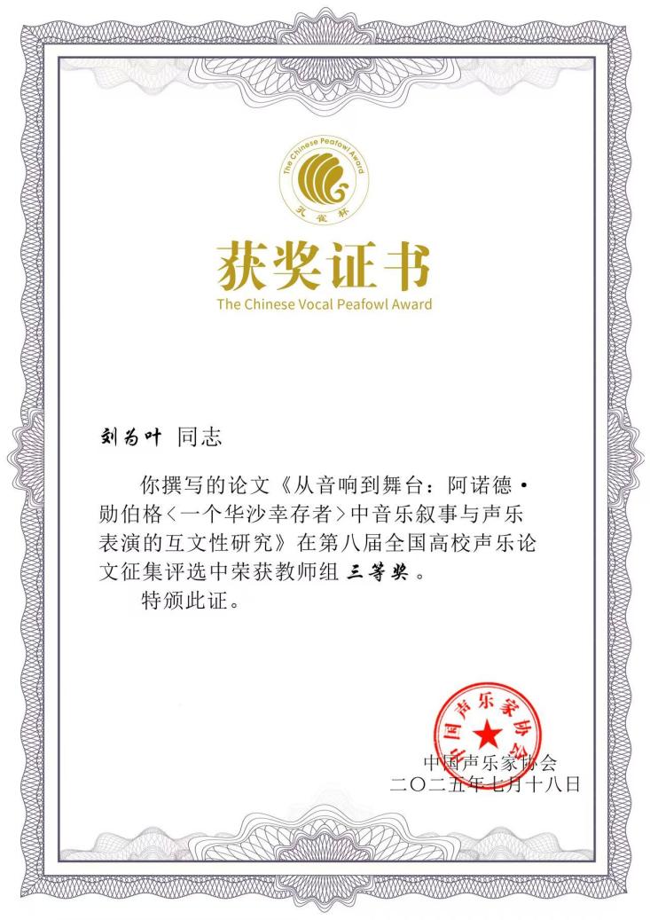 其中第八届 “孔雀杯” 全国高校声乐论文征集评选结果揭晓,WilliamHill中文官方网站人文与管理学院音乐学专业教师刘为叶撰写的论文《从音响到舞台:阿诺德・勋伯格〈一个华沙幸存者〉中音乐叙事与声乐表演的互文性研究》凭借扎实的学术功底与创新的研究视角,荣获三等奖,这一成绩不仅是对刘为叶老师个人学术能力的高度认可,也为学校在音乐学术研究领域增添了亮眼一笔。