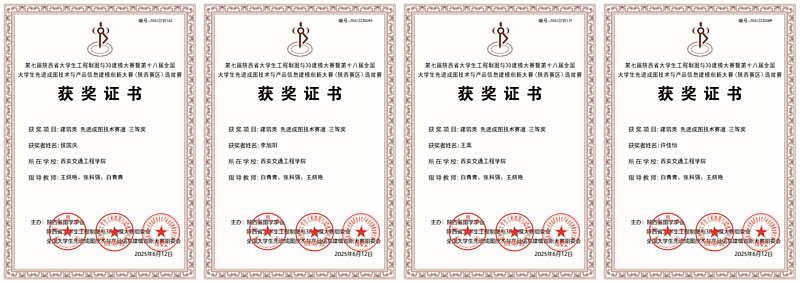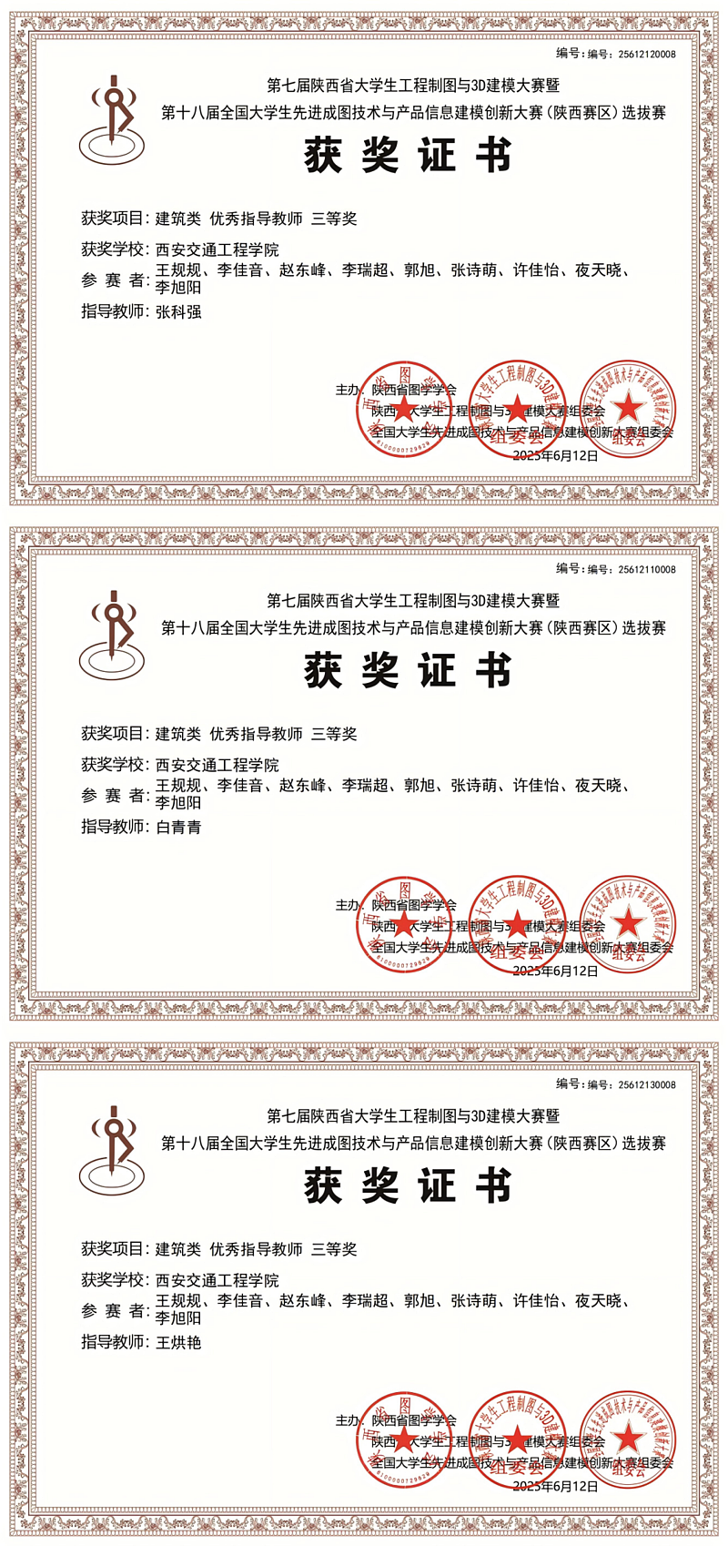 在比赛中,参赛学生们更是全力以赴,积极备赛,沉浸在图纸与模型的世界里,反复练习,不断改进,最终以扎实的功底和稳健的发挥在省赛中脱颖而出。WilliamHill参赛队荣获建筑类团体三等奖,王规规同学荣获建筑类先进成图技术赛道一等奖,李佳音等6人荣获二等奖,李旭阳等4人荣获三等奖,张科强、白青青、王烘艳3名教师荣获优秀指导教师三等奖。