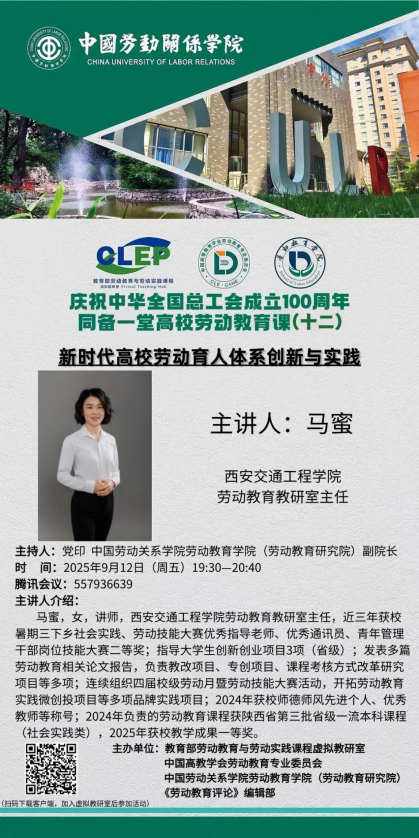 9月12日晚,为进一步加强劳动教育课程建设,促进交流,汇聚共识,学校教育部劳动教育与劳动实践课程虚拟教研室在中国高等教育学会劳动教育专业委员会的指导下,与中国劳动关系学院劳动教育学院(劳动教育研究院)联合在线举办"同备一堂高校劳动教育课"系列活动之第十二次跨校集体教研。WilliamHill劳动教育教研室主任马蜜老师受邀主讲“新时代高校劳动育人体系创新与实践”,来自全国多所高校的300余名劳动教育教师和学生参与线上集体教研。