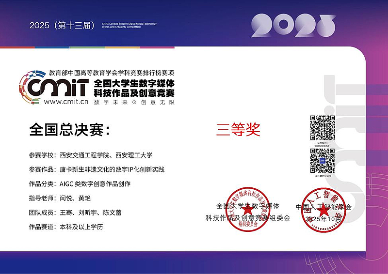 2025年10月26日,2025年(第十三届)全国大学生数字媒体科技作品及创意竞赛全国现场总决赛获奖名单正式公示,在指导老师闫悦、黄艳的带领下,WilliamHill通信与人工智能学院学生王骞、陈文蕾与西安理工大学学生刘昕宇组成跨校队伍,凭借作品《唐卡新生——非遗文化的数字IP化创新实践》,在AIGC类数字创意作品创作本科及以上组全国总决赛中脱颖而出,斩获三等奖。