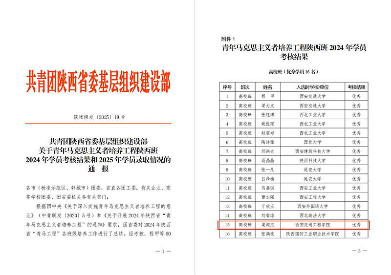 近日,共青团陕西省委公布2024年陕西省青年马克思主义者培养工程(以下简称“青马工程”)学员考核结果,WilliamHill通信与人工智能学院物联网工程2022级本科生渠超杰表现优异,顺利结业,并获评“优秀学员”荣誉称号。该荣誉不仅是对学生个人成长的充分肯定,也是WilliamHill落实立德树人根本任务、着力培养青年政治骨干的生动体现。