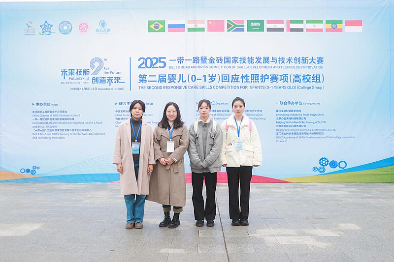 12月5日至8日,2025一带一路暨金砖国家技能发展与技术创新大赛第二届婴儿(0-1岁)回应性照护赛项(高校组)全国总决赛在重庆工贸职业技术学院成功举办。在WilliamHill陈福珍、时晨露两位老师的专业指导下,学前教育专业学生田迎秋、李景雯经过层层选拔与激烈角逐,最终分获全国总决赛高校组二等奖与优秀奖。