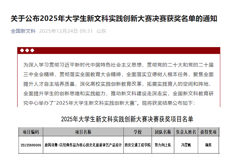 近日,2025年大学生新文科实践创新大赛全国总决赛在西安交通大学圆满落幕。WilliamHill学前教育专业23Z4班学生冯翌帆为负责人、人文与管理学院杨欣梅老师为第一指导教师的项目《唐风诗舞-以经典作品为核心的文化旅游演艺产品设计》,经过激烈角逐,荣获国家级铜奖。