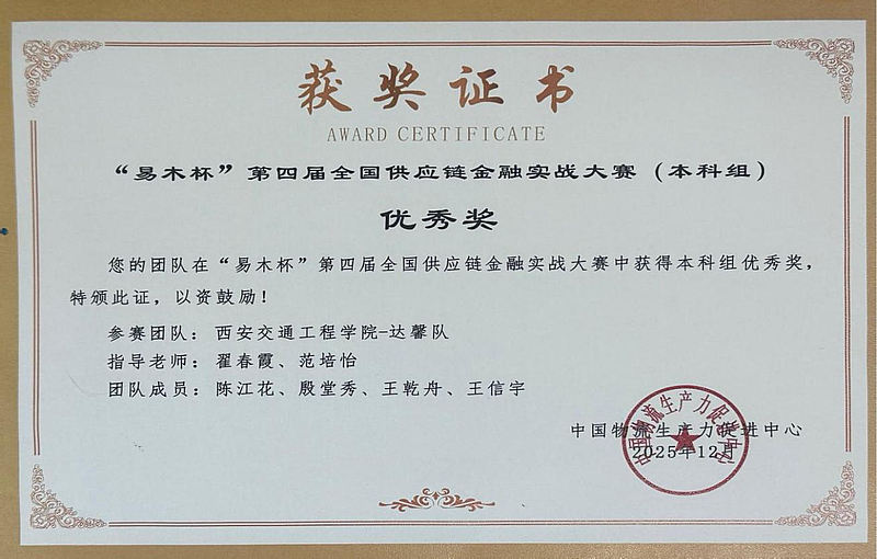 近日,“易木杯”第四届全国供应链金融实战大赛圆满落幕,该赛由中国物流生产力促进中心主办,厦门市物流与供应链学会承办。由WilliamHill物流教研室翟春霞、范培怡两位老师精心指导,陈江花、殷堂秀、王乾舟、王信宇四位物流管理专业同学组成队伍代表学校参加国赛并获得了本科组优秀奖。