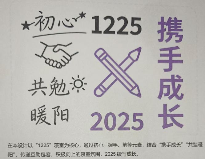 “舍”彩缤纷寝室门牌设计活动。同学们以灵感为刃、以热爱为料,将小小的门牌转化为浓缩宿舍灵魂的文化符号。萃取专属口号、共同理想等精神内核,用简约版式与鲜活色彩定格集体印记;融入兴趣特长、寝室故事等独特线索,以个性符号传递青春主张,搭配治愈插画寄托携手同行的心愿。每一份作品皆凝聚巧思,电子稿画质清晰、文字可辨。门牌不仅是标识宿舍的 “视觉符号”,更镌刻着室友间的默契与担当,每一次目光触及,都能唤醒专属的集体记忆与归属感。