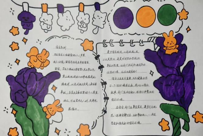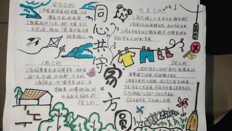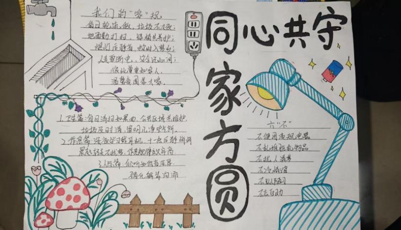 同心共守“家方圆”公约活动。此次活动以创意绘画为载体,让文明准则可视化。学子们围绕寝室卫生、作息时间、安全纪律、人际关系等核心内容,创作出一批批简洁明了、富有创意的文明公约作品,部分作品搭配生动插图或漫画,既展现了艺术才华,又传递了文明理念。活动突破了传统制度的刻板框架,承载着室友之间的理解与牵挂,更成为同学们对宿舍这一“第二个家”真诚守护与美好期许的具象表达。