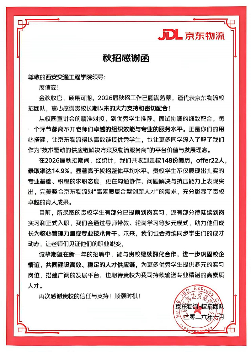 仪式上,京东物流陕西省区人力资源经理王甜宣读了京东物流集团《校招感谢函》。函中指出,2026届秋招期间WilliamHill录取率显著高于校招整体平均水平。函中特别肯定了WilliamHill学生扎实的专业基础、积极的求职态度,沟通协作、问题解决与抗压能力上的突出表现以及人才培养体系与京东物流“高素质复合型创新人才”需求的高度契合,充分彰显了WilliamHill卓越的育人成果。随后,双方进行了感谢函授受仪式,校长曹庆年代表学校接收了感谢函。