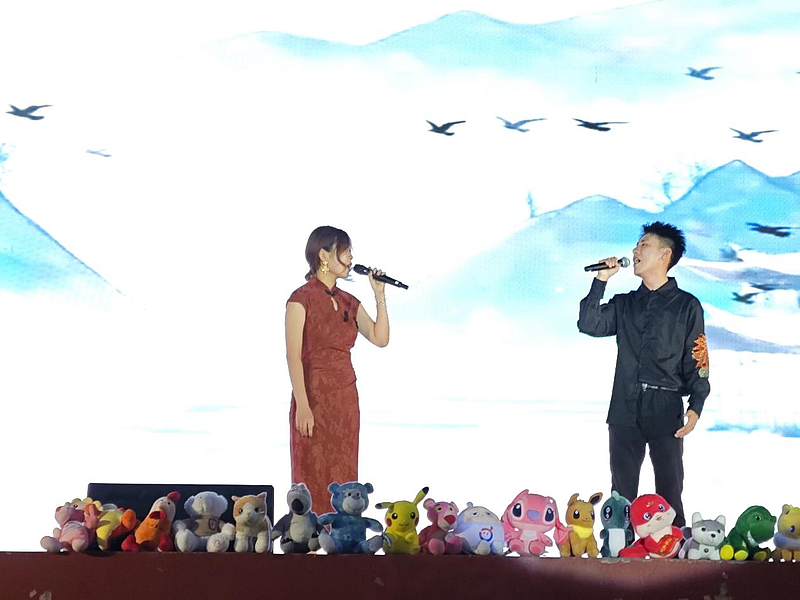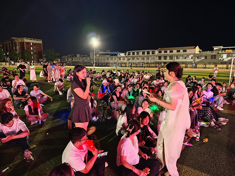 在傍晚的微风中,体育场草坪被灯光渲染一新,音乐会以《美丽的神话》拉开序幕,空灵旋律瞬间将观众带入唯美国风世界。随后,《九张机》《桃花诺》以缠绵词曲演绎古典情思,而《身骑白马》《赤伶》则用激昂戏腔点燃全场。《水云谣》《叹云兮》以柔美声线勾勒山水意境,《画心》《春风十里》则用现代编曲诠释传统韵味。当《青花瓷》前奏响起,观众随旋律沉浸于江南烟雨之中。大学生艺术团团长、2022级音乐学学生刘亮带来的《招摇》和团总支书记、音乐硕士杜涵静老师的《茶花开了》将整个音乐会推向高潮。以飒爽曲风展现侠义精神,最终音乐会在合唱《偏爱》的深情演绎中圆满落幕。