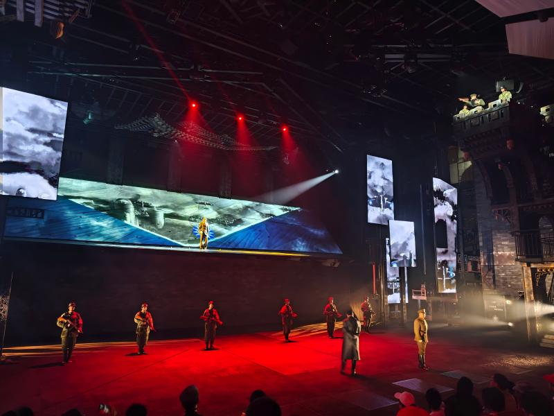 不同于传统舞台的“第四堵墙”,该剧采用“环形剧场+多空间叙事”设计:一侧是布置成1936年西安街头的实景舞台,旧报纸、黄包车、老城墙砖等道具细节考究;另一侧则是“历史档案馆”式的投影区,通过泛黄的影像资料与角色内心独白,串联起“九一八事变”后的民族危机、“一二·九运动”的学生呐喊,直至“西安事变”的和平解决。