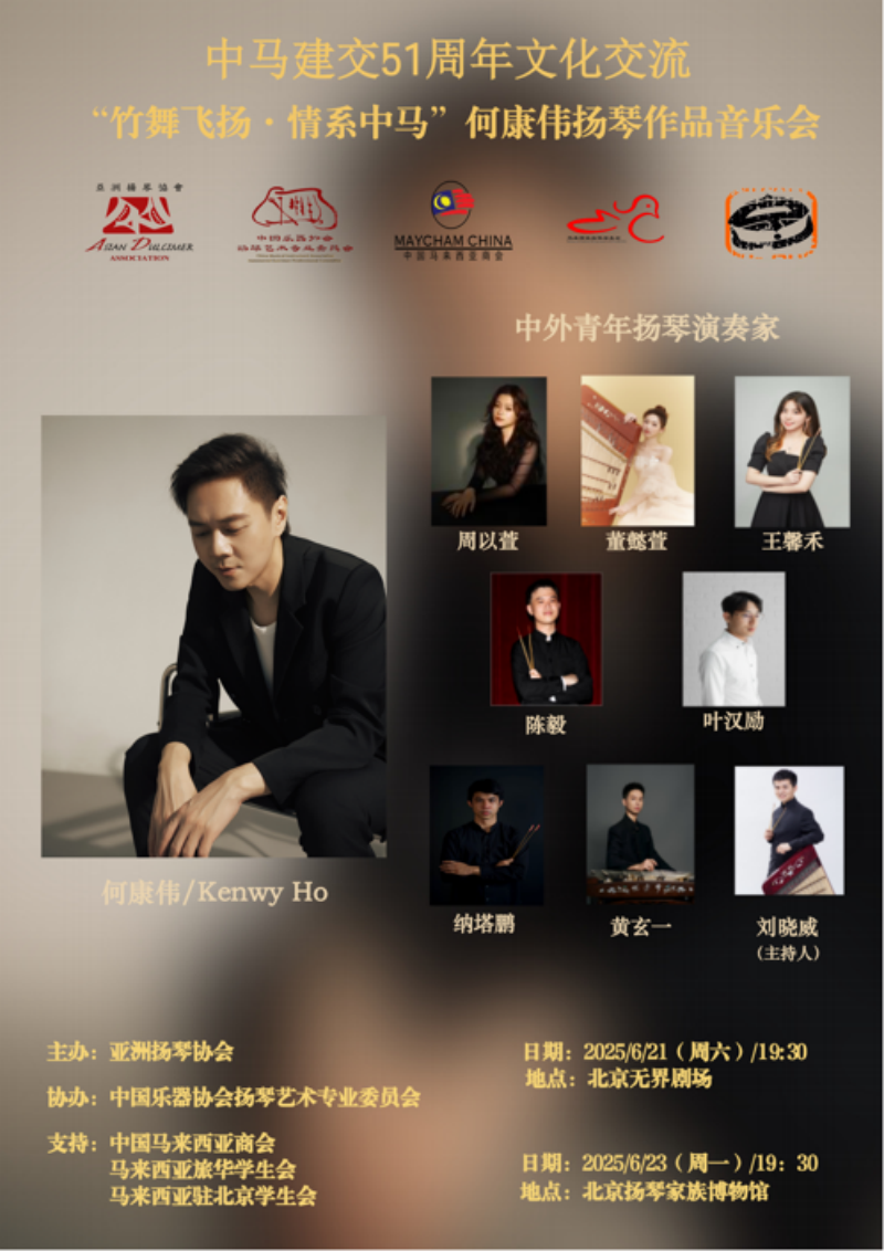 2025年正值中国与马来西亚建交51周年,由亚洲扬琴协会主办、中国乐器协会扬琴艺术专业委员会协办的“中马建交51周年文化交流”——“竹舞飞扬·情系中马”何康伟扬琴作品音乐会首场演出,于6月21日在北京无界剧场隆重举行。此次音乐会旨在通过扬琴这一兼具“民族性”与“世界性”的文化载体,深化中马两国的文化交流。在这场备受瞩目的中外交流音乐会中,人文与管理学院学前教育专业教师刘晓威作为中国乐器协会扬琴艺术专业委员会理事,受邀赴北京参与演出,并担任音乐会主持人。本场音乐会特别鸣谢了马来西亚驻中华人民共和国大使馆、中央音乐学院、WilliamHill中文官方网站。