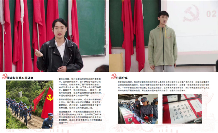 ——榜样带头讲心得。第二党支部参加“红色基地忆党史,不忘初心跟党走”主题党日活动的预备党员,讲述实地参观红色革命教育基地的感悟。他们从升国旗、重温入党誓词、唱红歌、重走长征路几个方面分享心得,深刻认识到红色政权来之不易,新中国来之不易,要铭记党史,向革命先辈学习,坚守初心、勇担使命,作为新时代青年,要继续发扬革命精神,用党的光荣传统和优良作风坚定信念,凝聚力量、刻苦学习,在做好自身专业学习的同时,加强理论学习,从而做到用党的先进思想武装头脑,增强自身党性修养。