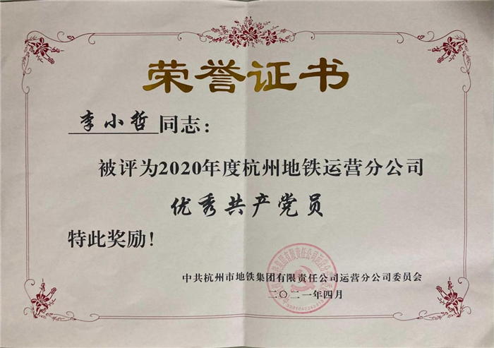 近期,从杭州市地铁集团有限责任公司运营分公司获悉,土木工程学院2019届交通工程毕业生李小哲被评为2020年度“优秀共产党员”。