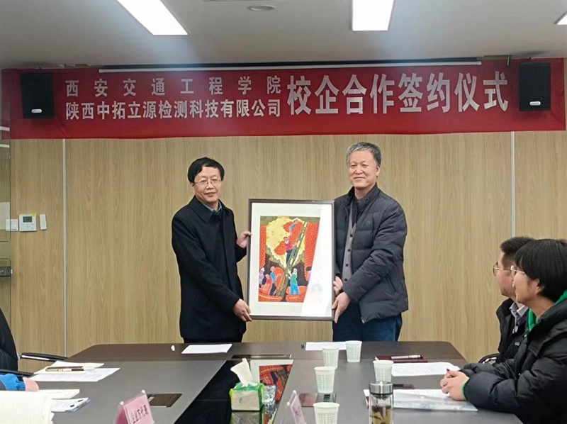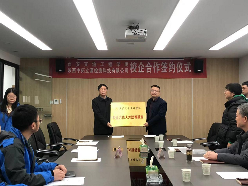 土木工程学院副院长杨瑞娟代表学校与陕西中拓立源检测科技有限公司总经理姚锁宁签订了校企合作协议,教务处副处长齐军营为“校企合作人才培养基地”授牌,张院长向该公司赠送了纪念品。