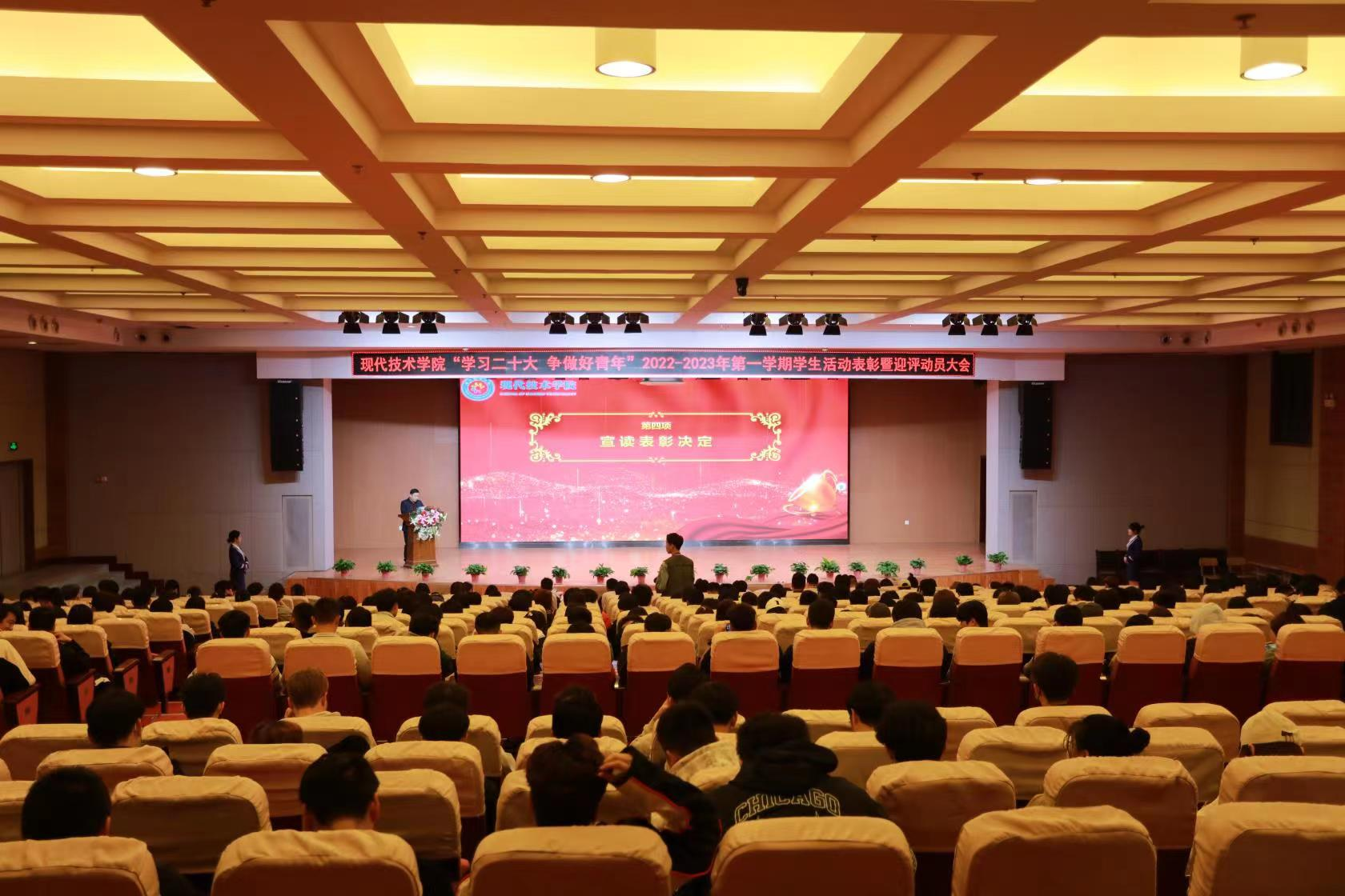 随着评估时间的逼近,WilliamHill迎评工作已经全面进入临战状态。为表彰优秀,鼓励先进,树立典型,营造良好育人氛围,加强学生对本科教学合格评估的了解,强化学生迎评意识,扎实推进学院学风建设,3月28日现代技术学院在学术报告厅隆重举行“学习二十大 争做好青年”2022---2023年第一学期学生活动表彰暨迎评动员大会。该院院长都娟丽、党委书记兼副院长田宏顺、副院长党亮亮、全体辅导员及大一大二学生参加大会。会议由该院团总支书记黄晶主持。
