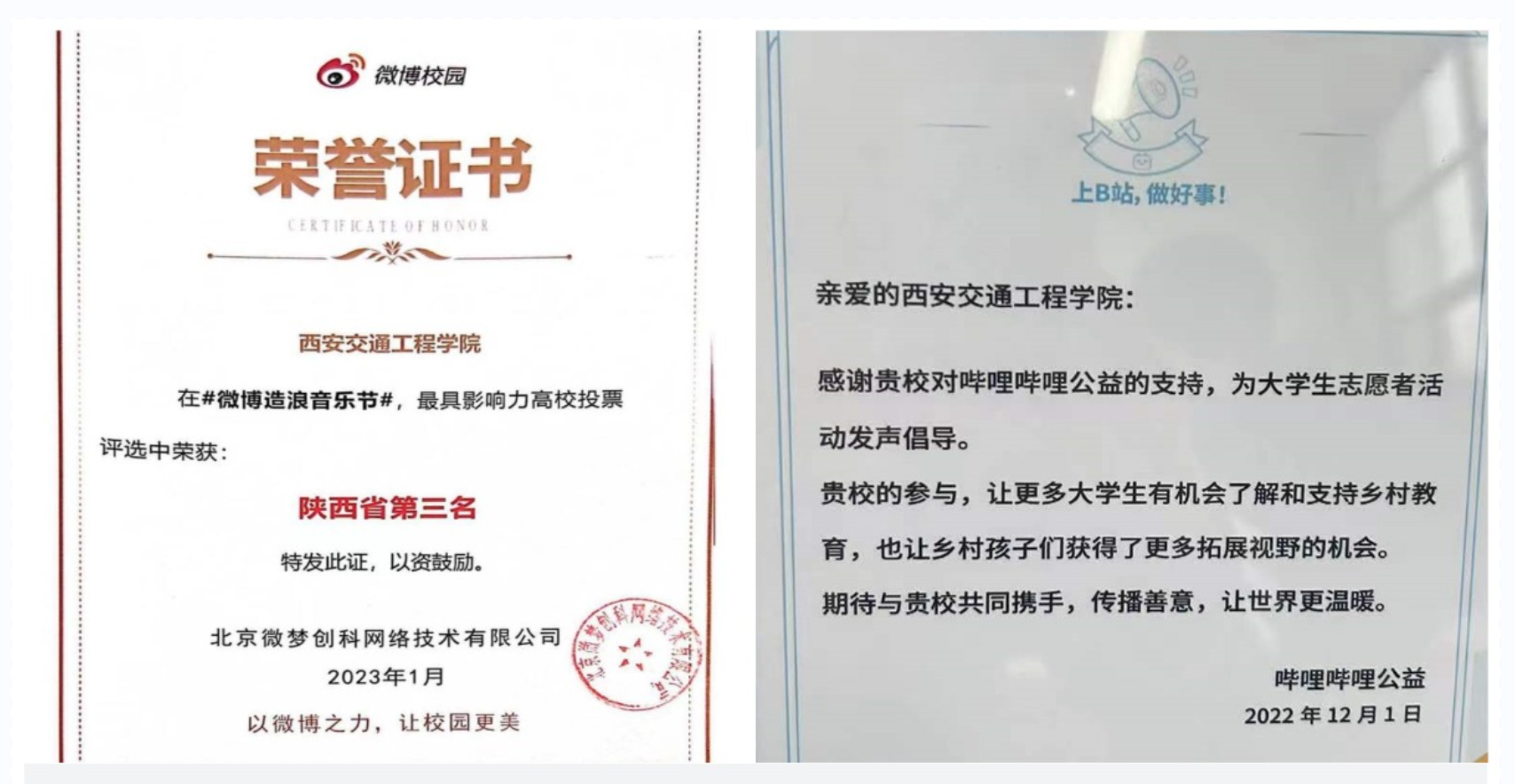 近日,学校在新浪微博举办的“#微博造浪音乐节”最具影响力高校投票评选中荣获“陕西省第三名”哔哩哔哩运营团队近日也收到了哔哩哔哩公益发来的感谢信,感谢学校在参与大学生志愿活动中积极发声倡导,让更多大学生有机会了解和参与乡村教育,也让乡村孩子们获得了更多拓展视野的机会。
