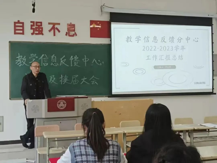 首先,由上届交通运输学院教学信息反馈分中心副主任罗家纬对2022-2023学年的工作进行总结,其指出交通运输学院交通运输专业(本科统招)18人,交通运输专业(专升本)18人,共计36人参加信息反馈工作。本学年继续使用电子版问卷和纸质版报。其次,将在教学条件方面、学生学习方面、教师教学方面反映的数据展示出来,并提出具体的解决方案。最后,他提出下步工作方向。