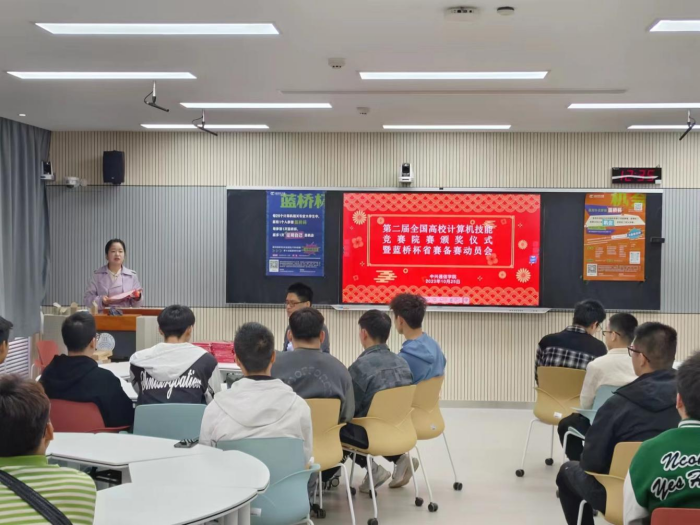 10月27日,中兴通信学院举办第二届全国计算机技能竞赛颁奖仪式暨蓝桥杯省赛动员会,本次会议由孙媛老师主持,中兴通信学院副院长王冠军、教师代表杨碎明、杨春霞以及获奖同学参加了会议。
