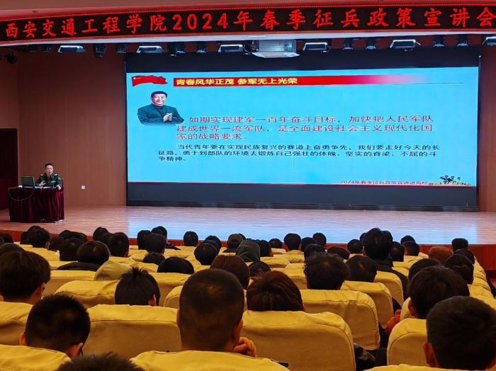 为向广大同学宣介中国人民解放军征兵政策,宣传军队建设、发展情况,吸引更多优秀年轻人加入国防事业队伍,为祖国的繁荣富强贡献力量。11月29日,2024年(春季)大学生征兵政策宣讲大会在学术报告厅顺利召开,本次宣讲会邀请了鄠邑区人武部政委刘永飞同志、人武部副部长董乐同志,出席宣讲会的有学生处处长钱穆萨、学生处副处长黄元元、各学院辅导员老师、2024年毕业生及2024意向参军的同学们。会议由黄元元主持。