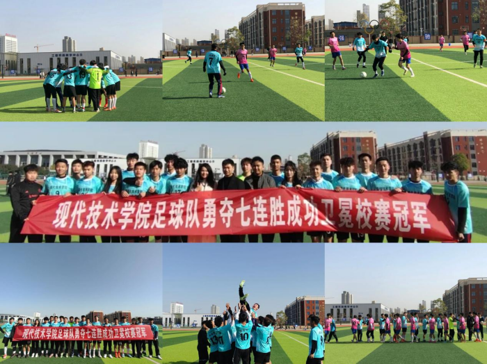 ——勇夺七连胜成功卫冕“道钉杯”足球赛冠军。历经一个月的激烈角逐,现代技术学院足球队终坚持友谊第一,比赛第二的原则,从全校六个学院组成的众多参赛队伍中以七连胜,进22球仅丢1球的傲人战绩强势卫冕,夺得本次联赛的冠军!比赛中现代球队敢打敢拼、永不言弃,赛出了风格、赛出了水平,展现了现代学子良好的精神风貌和竞技水平,传递了积极向上、永不言败的体育精神,希望该院球员积极进取,拼搏向上,逆境中不服输,优势中会反思的精神永不落幕!