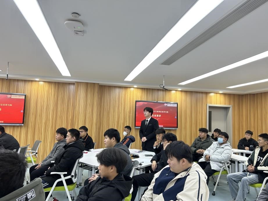 中铁五院副总工程师、注册测绘师杜兆宇和办公室主任刘萍萍通过播放宣传片、面对面交流的方式对公司的情况以及企业人才发展通道、福利待遇、组建订单班的学习情况等进行了详细介绍。杜兆宇表示,中铁五院将充分发挥企业在产业和技术方面的优势,为学生提供丰富的实践资源和专业指导,助力学生在校期间就能掌握行业前沿技术。同时,他希望同学们珍惜这次难得的校企合作机会,鼓励学生积极参与订单班,努力学习,掌握企业所需的岗位技能,注重实践能力的培养,争取走入工作岗位后能胜任工作并成为佼佼者,为我国测绘与地理信息产业贡献自己的力量。