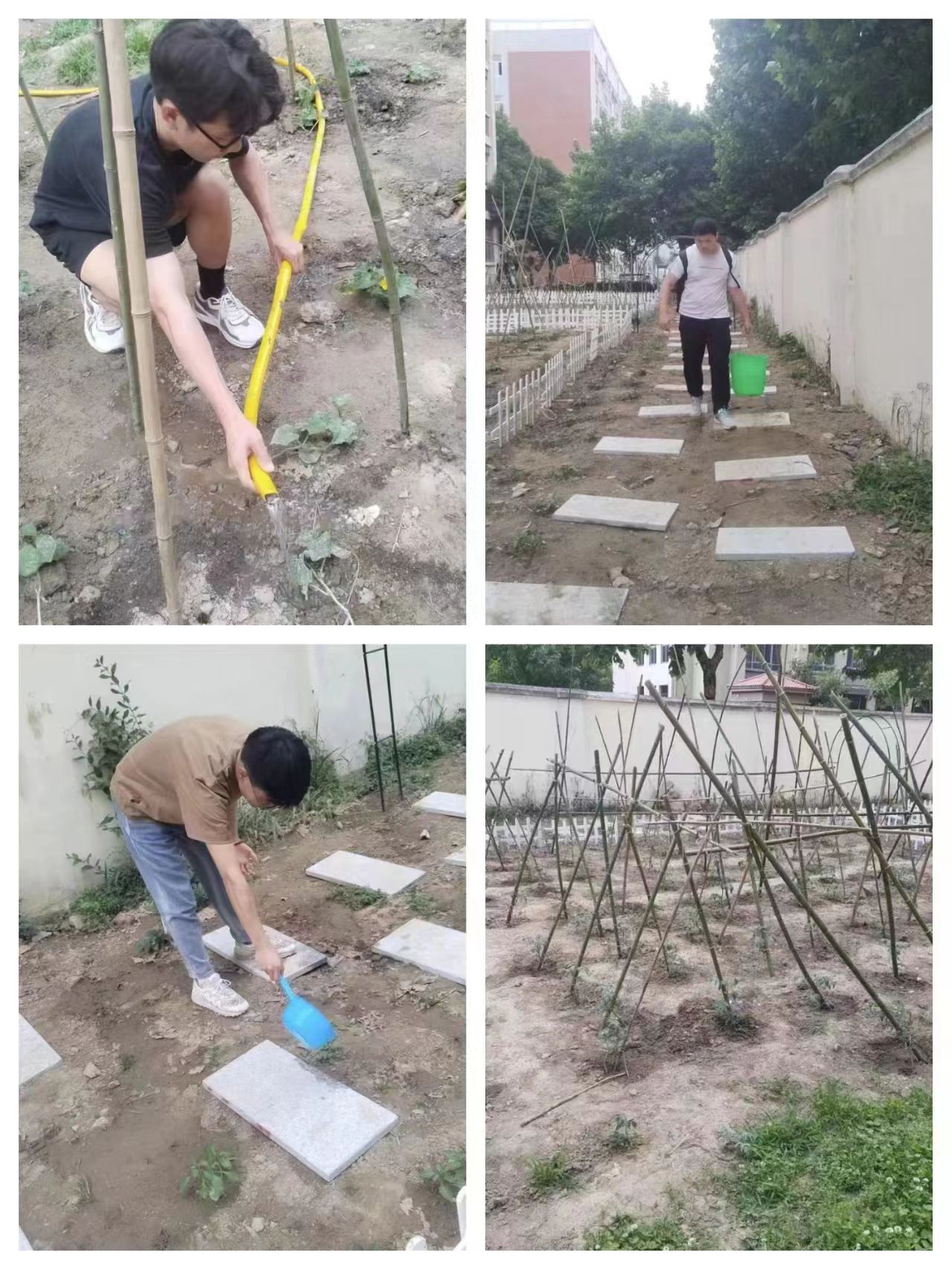 ——“农耕文化园”劳动教育实践基地的美化与亮化。实基地要从一片野草到达种植的效果,期间的美化亮化不可或缺,自2024年春季学期开始,在劳动教育实践课程中老师们带领学生从墙体美化到美化井盖,再到根据测量规划安装栅栏、安装花架,以及铺设道路,每一次劳动都是倾注了师生们的心血与汗水,墙体美化洒在了学生的衣服上,安装栅栏需要学生用心用力,石板铺设道路更是学生一块块的抬去铺设,这块土地既是学生们实践的平台,又是学生们劳动的场所,大家对成果充满期待。