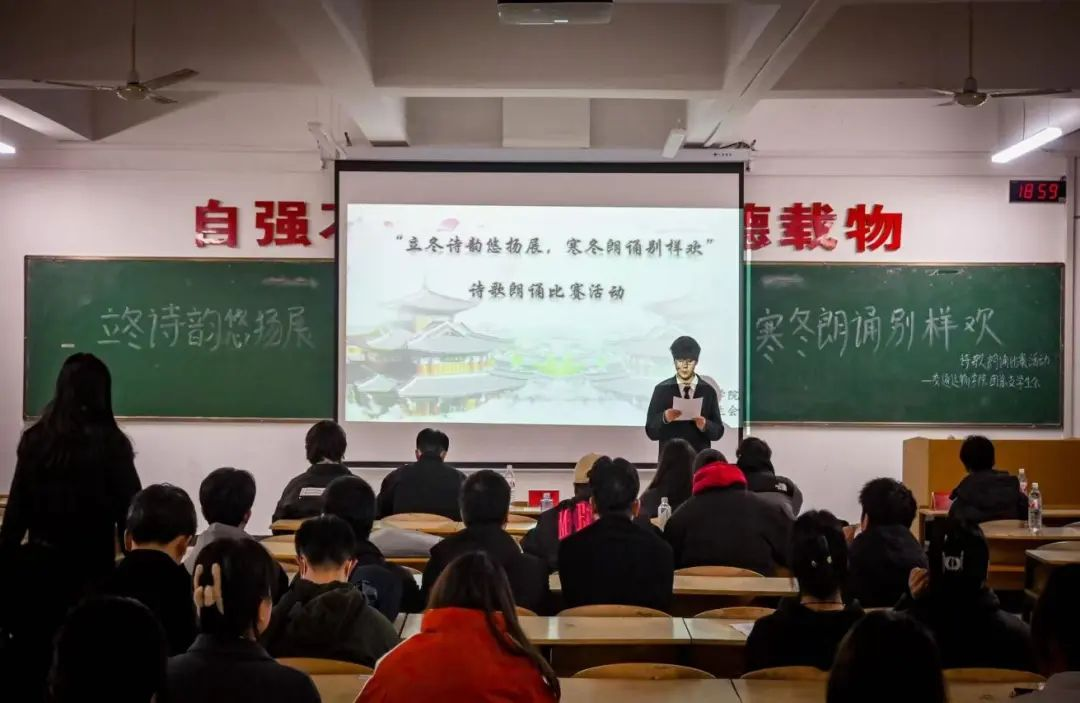 为弘扬中华优秀传统文化,提升学生文化素养,增强文化自信与民族自豪感,12月8日,交通运输学院举办“立冬诗韵悠扬展,寒冬朗诵别样欢”诗歌朗诵比赛在5-201教室顺利举行。