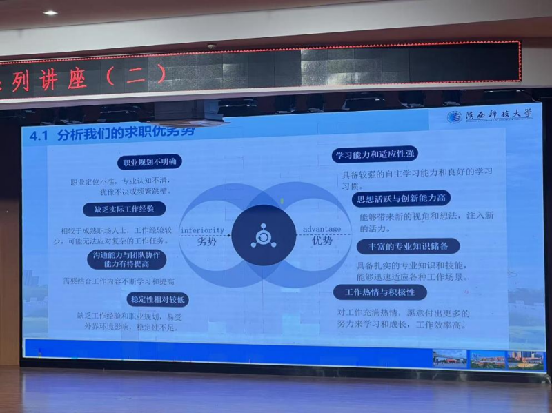 为帮助大二学生提前规划职业生涯,准确把握就业形势,提升就业竞争力,3月30日,现代技术学院在报告厅成功举办“就业突围实战指南”讲座。本次讲座大二年级全体学生及学院辅导员参加,由学院党委书记兼副院长田宏顺主持。