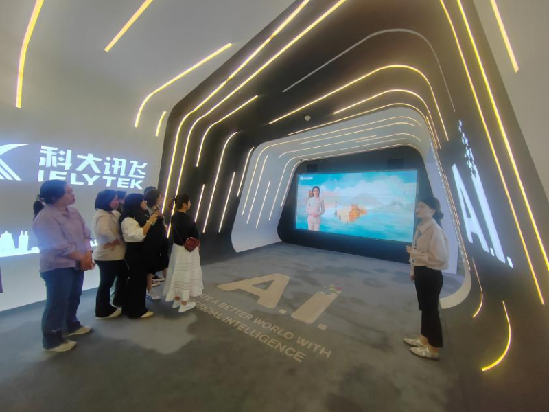 下午14:30时,教师团队在科大讯飞技术人员的引导下,参观了企业展厅及创新实验室。通过全息投影、实时交互等技术形式,教师们重点体验了智能语音交互系统、AI+教育平台等核心产品。其中,讯飞“星火认知大模型”在通信网络故障预测、多模态数据融合分析等场景的应用案例,引发了教师们对“AI赋能传统通信技术”的深度思考。