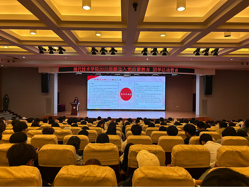 为加强2025级新生的思想引领,帮助新生了解入党流程、坚定政治信仰,并熟悉团学活动体系、夯实全面发展基础,9月22日,现代技术学院在学术报告厅举行2025级新生入党启蒙教育暨团学活动教育。学院党委组织委员、学生第三党支部书记田佳丽、团总支书记兼2025级年级组长黄晶、新生辅导员及全体2025级新生参加活动。