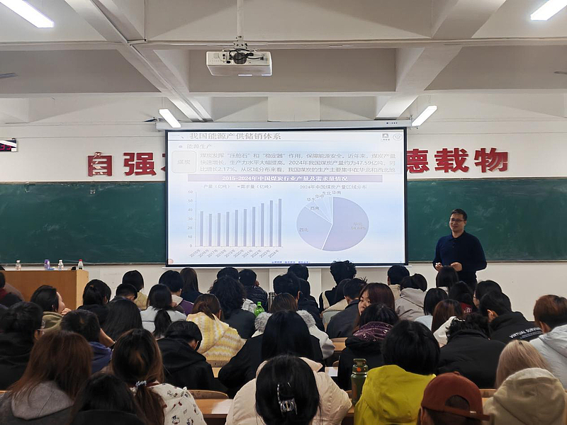 讲座中,邹绍辉教授以系统而全面的视角,深入梳理了我国能源产供储销体系,不仅阐明了传统能源,尤其是煤炭作为“压舱石”和“稳定器”在保障能源安全中的不可替代作用,还展示了新能源如风电、光伏发电的快速发展态势,共同勾勒出一幅多元协同的能源供应新格局。他结合最新数据与案例,对关键能源供应网络进行了细致入微的解读,包括煤炭的“西煤东运”、“北煤南运”运输体系,油气管网的“全国一张网”布局,以及电网中特高压骨干网架与新能源接入比例的显著提升。邹教授不仅分析了当前能源绿色转型和技术创新的现状,还对相关政策导向进行了深入剖析,为师生们呈现了一场内容丰富、专业深度与实践价值并重的学术盛宴。