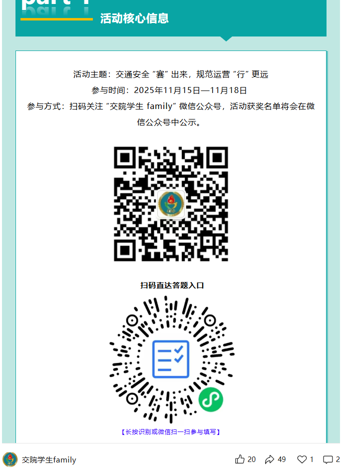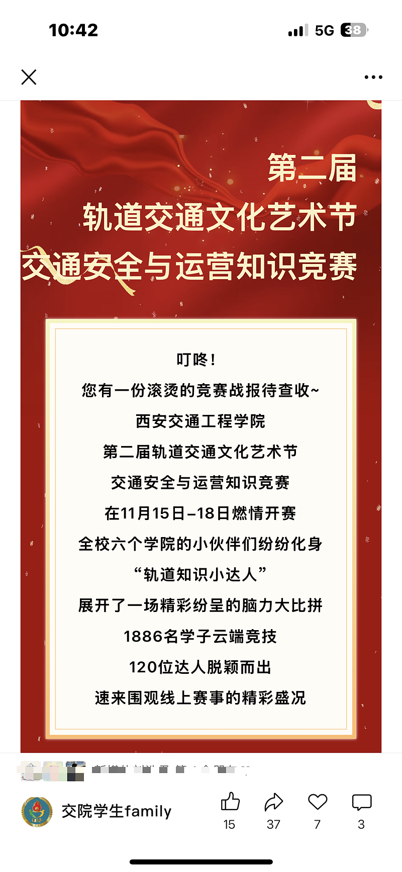 本届知识竞赛由校团委主办、校学生会学业发展部承办,这不仅是一场专业知识的较量,更是智慧碰撞的舞台和专业技能提升的重要平台。通过数字化赛事新体验,有效促进了学生对轨道交通专业知识的深入理解,展现了当代学子勤奋好学、积极向上的精神风貌。校团委表示,将以本届竞赛的成功举办为契机,持续优化赛事体系,不断完善竞赛形式。未来将致力于为学子提供更智能的答题系统、更多元的竞赛形式和更广泛的参与平台,持续打造具有影响力的精品赛事,为培养高素质专业人才贡献力量。