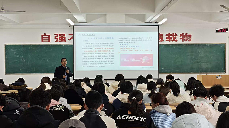 他先从文化的定义、“人的文化”切入,以陕西与浙江地域文化差异及发展影响为例,让师生直观理解文化对人的重要意义。随后讲解文化功能时,巧用“杯子的功能”类比,将抽象的理论概念通俗化,进一步强化了对文化重要性的认知,为后续企业文化的讲解奠定了基础。进入企业文化核心讲解环节,赵德利明确指出企业文化兼具组织属性与战略资源的双重内涵。他以京东文化宣言、规章制度为实例并结合往届学子实习经验,具体剖析了企业文化如何塑造职场思维与行为模式,让抽象的企业文化落地到学生未来职业发展的实际场景中。