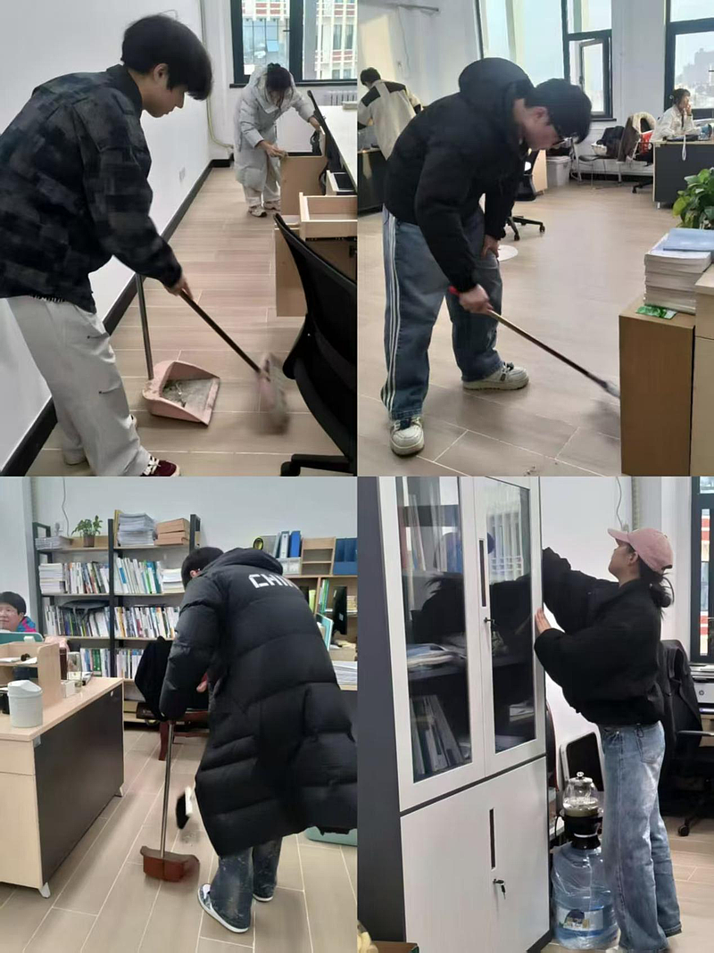 活动期间,各小组按既定分工迅速投入清扫工作,现场忙碌而有序:大家各司其职、默契配合,有人细致擦拭办公桌、电脑周边及门窗玻璃,去除积尘污渍;有人小心整理文件资料、报刊杂志,确保桌面整洁有序;有人专注清扫地面角落、桌下缝隙等卫生死角,不放过任何一处盲区。全体成员以认真负责的态度投入劳动,在不影响教师办公的前提下,高效完成清洁任务,让每间办公室都焕然一新。