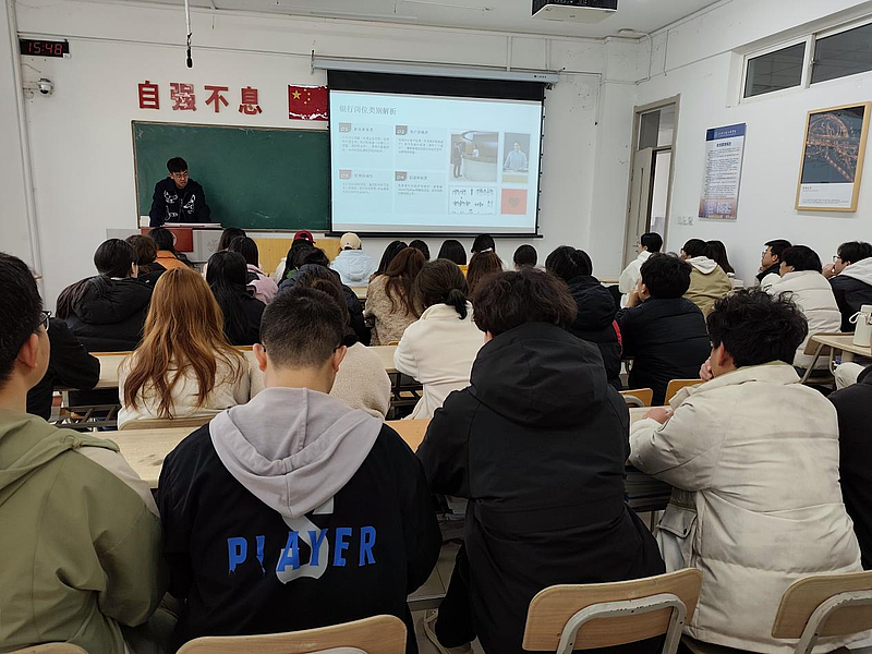 分享会上,高凯明学长分享了他的求职历程与行业洞察,从银行业求职的流程进行介绍,分为网申、笔试和面试三块,其中面试核心在于展现自信、真诚与团队协作等综合素养,而非复杂技巧。随后指出在入职后通常有集中培训与轮岗期,这是认识同事、了解岗位的好时机。最后指出不同银行在薪资、工作强度、职业发展等方面的优劣势,建议同学们采取“广撒网”策略争取多个机会。